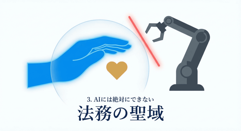 相手方の顔色を読み、落とし所を探る**「交渉(ネゴシエーション)」**こそが、人間の法務に残された最大の付加価値です。