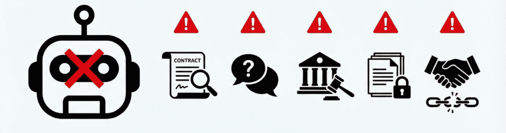しかし、AIには**「致命的な弱点」**があり、法務のすべてを任せることは企業の存続に関わるリスクになり得ます。